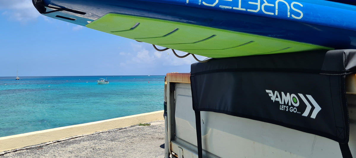 The Vamo Tail Gate Pads will keep your boards organized and free from calamity while on the road. UV resistant nylon and EZ on EZ off silicone padded buckles keeps your boards scratch free and your pad in place. Holds up to 3 boards. Printed with the Vamo "Let's Go..." logo.